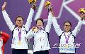 29일 오후(현지시간) 런던 크리켓 그라운드에서 열린 여자양궁 단체 결승전에서 승리한 최현주,기보배,이성진 선수가 시상식에서 팬들을 향해 환호하고 있다.20120729런던=올림픽사진공동취재단L